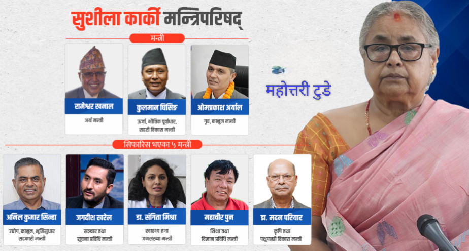 काठमाडौं । नवनियुक्त चार मन्त्रीहरूले आज राष्ट्रपति रामचन्द्र पौडेलसमक्ष पद तथा गोपनीयताको शपथ ग्रहण गरेका छन्। प्रधानमन्त्री सुशीला कार्कीको सिफारिस...